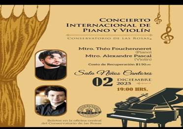 Con sensibilidad el rector Raúl Olmos Torres está invitando a maestros, alumnos y amantes de la música a disfrutar del programa de conciertos internacionales que se desarrollarán en el Conservatorio con motivo del fin de año. Para ello, está ofreciendo descuentos especiales para quienes se dediquen a la música y para las personas de la tercera edad. El ciclo iniciará el día 02 de diciembre con la participación de artistas provenientes de París, ellos son el pianista: Theo Fouchenneret y el violinista Alexandre Pascal. La cita es en la sala niños cantores de Morelia en punto de las 19 horas, los boletos se pueden adquirir en las instalaciones centrales del Conservatorio.