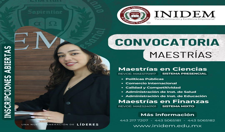 Se encuentra abierto el período de registro de los profesionistas interesados en integrarse a la Maestrías y Doctorados que ofrece el Instituto. El ciclo escolar iniciará en el mes de febrero del 2026. Mayores informes en el teléfono 4432177207 o en la página www.inidem.edu.mx El rector Federico González Santoyo atiende de manera personal las inquietudes y necesidades de los aspirantes.