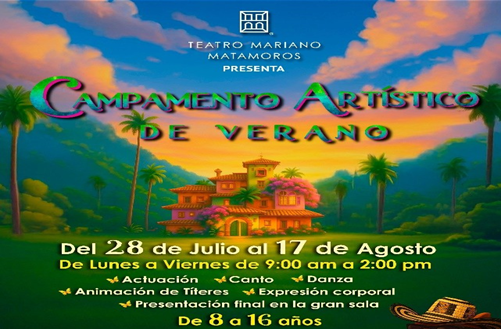 Se ha hecho oficial la realización de una nueva edición del “Campamento Artístico de Verano”, el cual se desarrollará del 28 de julio al 17 de agosto en horario matutino, con una gran diversidad y riqueza de actividades artísticas que se expresará con una presentación final en el escenario del Teatro. Mayores informes y venta de boletos en las taquillas del teatro.